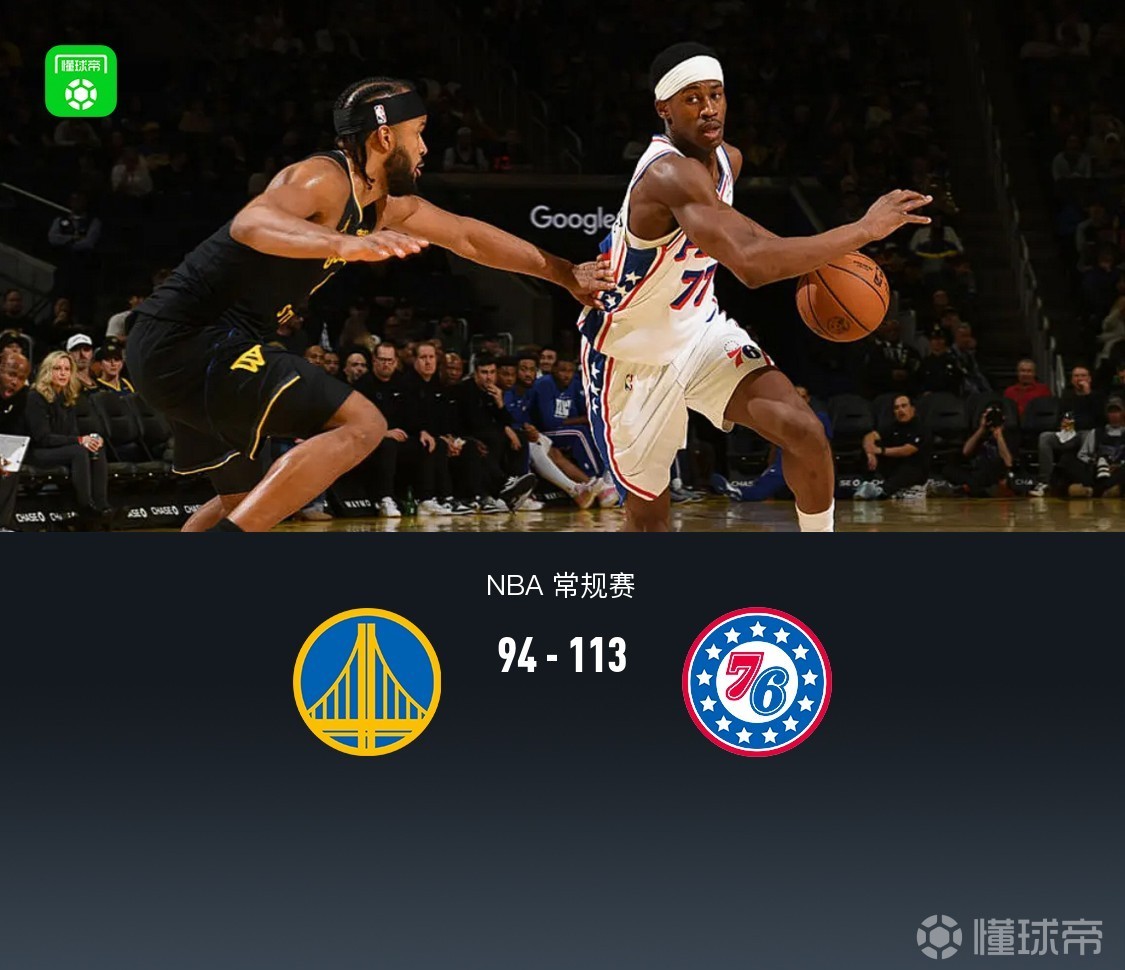 第四节,开节76人埃奇库姆、沃特福德相继得分,勇士霍福德、波杰姆斯基、梅尔顿回应,随后勇士突然进攻断电,76人多点开花马克西、德拉蒙德、沃特福德联手得分持续拉大分差至20分以上,全场结束,勇士94-113不敌76人。