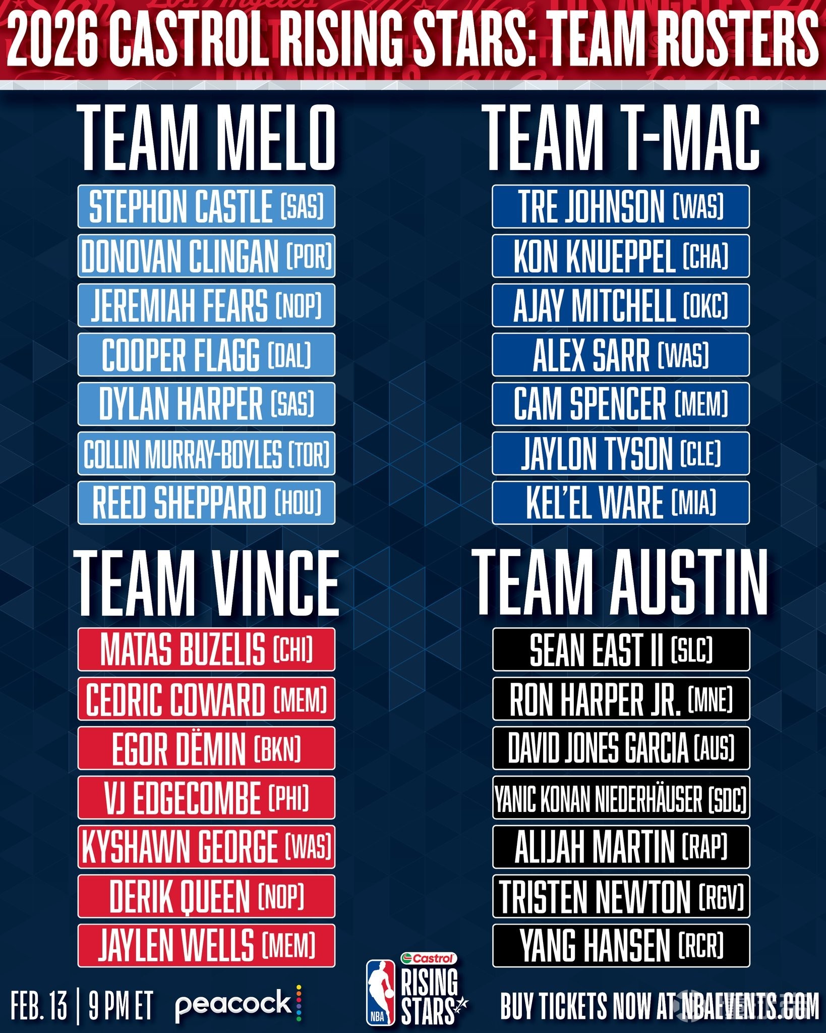 北京时间1月31日,NBA官方公布了2026年全明星新秀赛的对阵形势,杨瀚森所在的G联赛队将对阵由拥有弗拉格和克林根并由卡梅隆-安东尼挂帅的Team Melo。