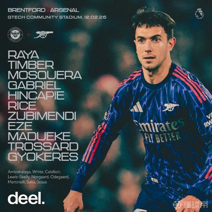阿森纳首发:1-拉亚、5-因卡皮耶、6-加布里埃尔、3-莫斯克拉、12-廷贝尔、41-赖斯、36-苏比门迪、10-埃泽、19-特罗萨德、14-哲凯赖什、20-马杜埃凯