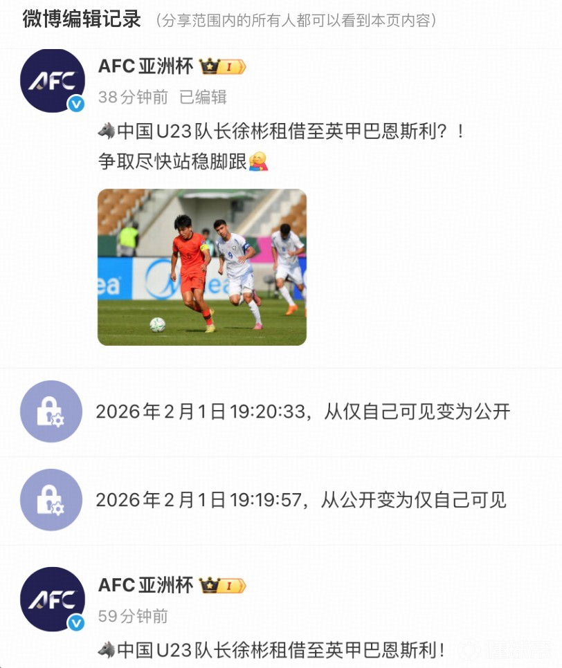 亚洲杯官方账号在发布动态,写道:“中国U23队长徐彬租借至英甲巴恩斯利!争取尽快站稳脚跟”。