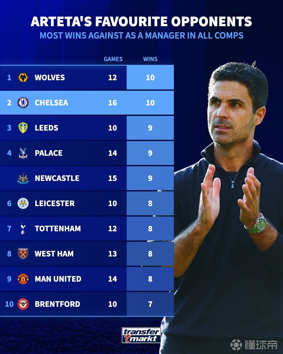 根据德国足球转会市场的最新统计,阿森纳主帅阿尔特塔在执教生涯中,面对切尔西取得了16场10胜的战绩,这是他赢球次数最多的对手,与狼队并列胜场榜首位。