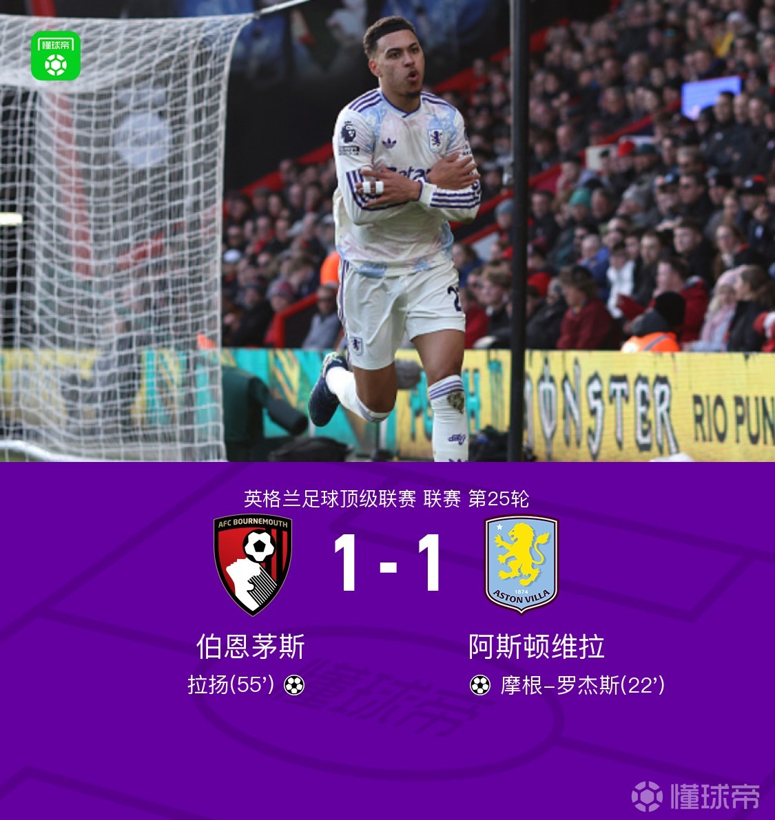 第22分钟,摩根-罗杰斯右路劲射破门,维拉1-0领先伯恩茅斯