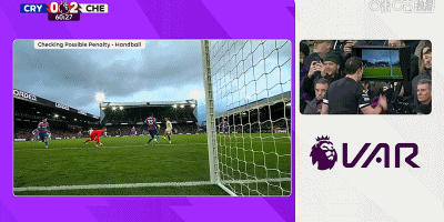在切尔西以2-0领先时,水晶宫后卫康沃用手臂挡住了若昂-佩德罗的射门。裁判达伦-英格兰允许比赛继续,但VAR马特-多诺霍让达伦-英格兰去场边观看回放。
