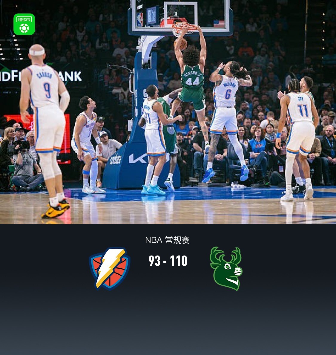 第四节雷霆以赛亚-乔拿下6分,雄鹿AJ-格林拿下5分,最终雷霆93-110不敌雄鹿