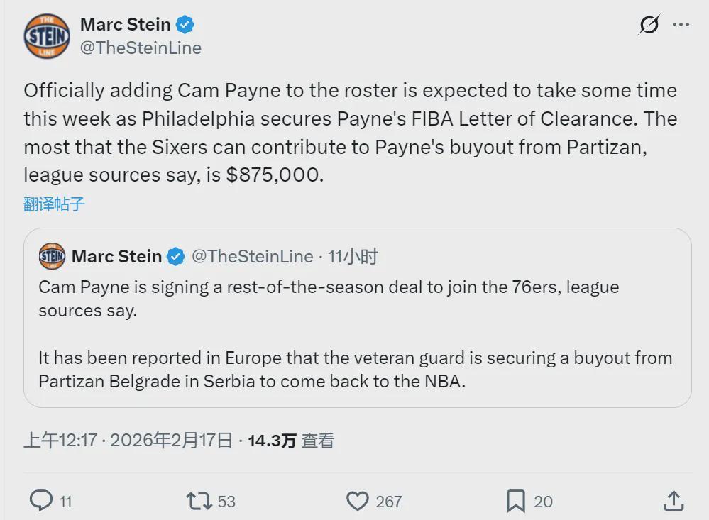 也就是说,剩余的87.5万买断费需要佩恩自掏腰包。2024年夏天,亚布塞莱为了重返NBA,自己支付了165万美元的买断费、加盟76人!2025年10月份,步行者曾经给了佩恩一份训练营合同,佩恩被裁之后离开NBA、前往欧洲打球。