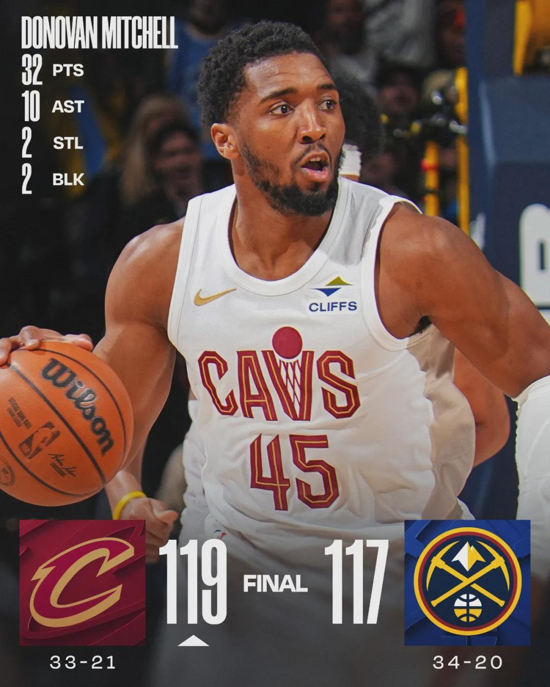 骑士三人砍下20+10:米切尔23投11中,三分10中3,罚球8中7,砍下32分10助攻2抢断2盖帽,正负值+3。米切尔赛后说道:“我们的新阵容还没有真正合练过,就是凭感觉打球。”贾莱特-阿伦16投10中,得到22分13篮板1助攻。